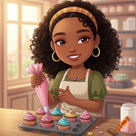 | Title | A cute cartoon girl with curly hair smiles while piping pink frosting onto cupcakes in a baking ... |